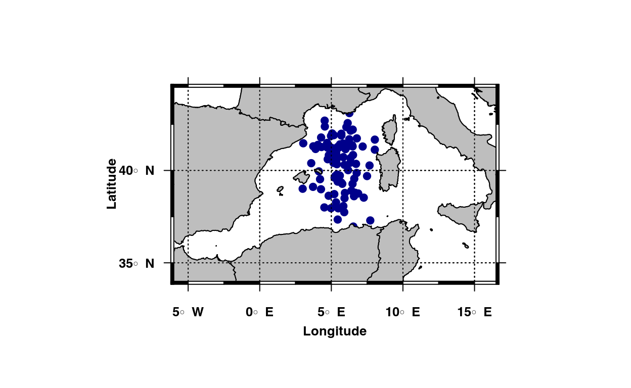 points(catch_lon,catch_lat,pch=19,col="darkblue")