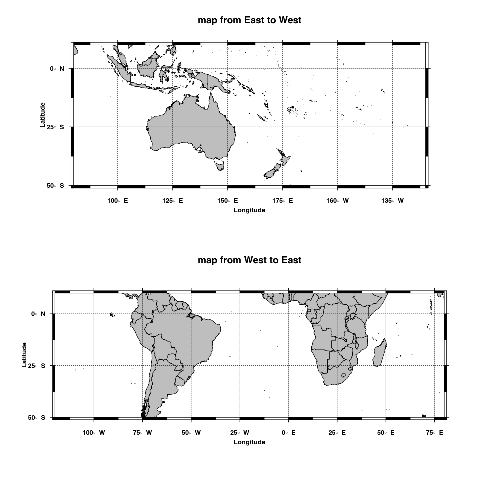 plotmap(lon=c(80, -120), lat=c(-50, 10), main="map from East to West")