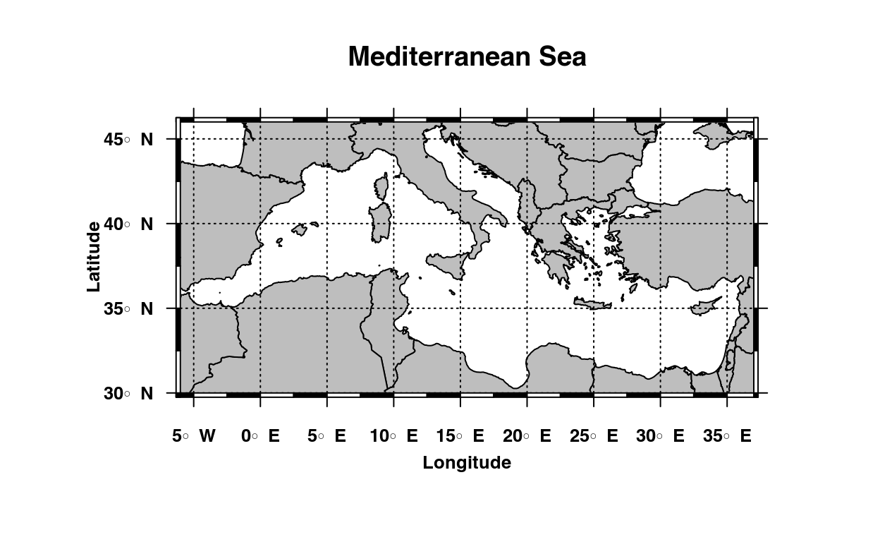 plotmap(lon=lon, lat=lat, main="Mediterranean Sea")