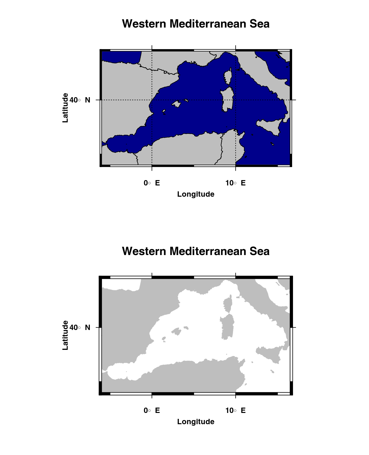 plotmap('medw4', main="Western Mediterranean Sea",col.bg="darkblue")